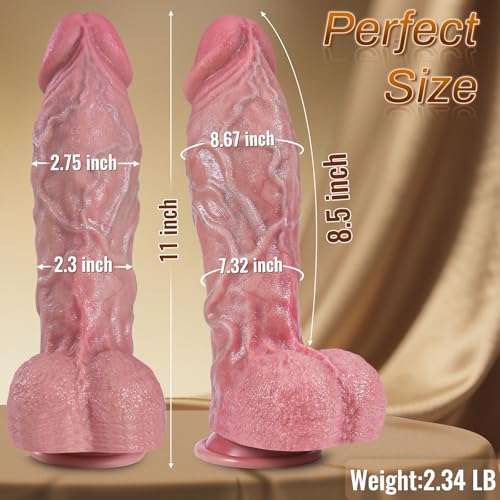 Large-Size & Double-Layer Structure – The huge dildo measures 11 inches in total length with a maximum diameterof 2.75 inches and weighs 2.34 pounds. The dual-layer design provides a firm inner core and softouter layer for a realistic and satisfying experience.