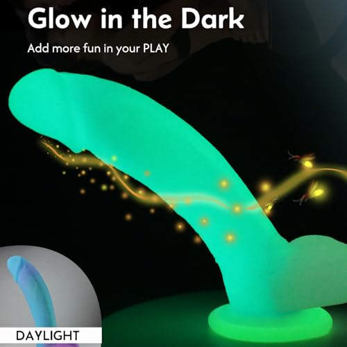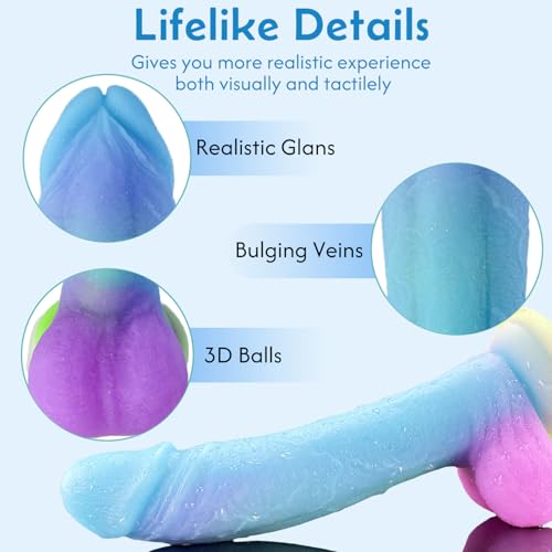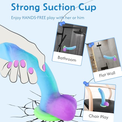 Gradient colorful, luminous and lifelike dildo: the big dildo has a colorful appearance rather than flesh color of the male penis. Glow-in-the-dark makes it mysterious and sexy,sure to be a brand new sex toy for you, full of freshness and excitement. In addition, thick penis, bulging veins, realistic glans and wrinkled testicles, these are all designed to mimic a true man’s dick. It can ignite your inner fire of sex desires with its wild colors and realistic feel