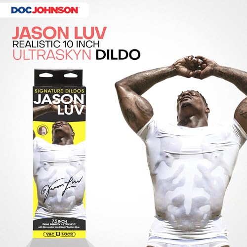 This dildo was molded directly from Jason Luv. It comes with a fabric bag for discreet travel and storage. It also comes with a removeable Vac-U-Lock Suction Cup. Total Length: 10 in. (25.4 cm), Insertable Length: 8.5 in. (21.6 cm), Width/Diameter: 2 in. (5.1 cm), Circumference: 6.5 in. (16.5 cm). Constructed of Dual Density ULTRASKYN material this product is designed to mimic the the feel of a real penis. The ULTRASKYN material on the inside of the dildo is firm while not being overly rigid. The ULTRASKYN material on the outside is soft and feels just like skin of an erect penis. The ULTRASKYN material readily absorbs body heat and quickly warms to a body temperature. This dildo features a removable Vac-U-Lock suction cup. With the suction cup attached the dildo will stick to most non-pourous smooth surfaces. With the suction cup removed this dildo can be attached to any of the Vac-U-Lock harnesses for a completely different experience. It can also be attached a any thrusting machine that utilizes the Vac-U-Lock system. The possibilites are endless. Like all products produced by Doc Johnson the materials used are phthalate-free and body-safe. For Adults Only.